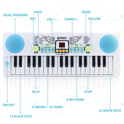 【37 Keys Piano Keyboard with Microphone】The 37 keys small piano toys for 3-5 year old children is equipped with complete 37 keyboard keys, built-in 16 demos, 8 DJ songs, single speaker and microphone. When children play this piano keyboard, they can not only play the piano, but also sing, help develop children's musical talent and children stage performance at an early age 3 year old or so. It is the excellent music toys for 3-5 years old boys and girls as ideal kids toys.
