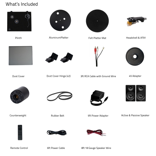 What's Included: RT80 Turntable, Dust Cover, 2x Dust Cover Hinges, Headshell with Audio Technica AT91 Cartridge, Counterweight, Aluminum Platter, Rubber Belt, 45 Adapter, Felt Platter Mat, 3ft RCA Cable With Ground Wire, 5ft 100V - 240V (50/60Hz) AC Power Adapter, User Manual, Ai41 Powered Bookshelf Speakers (pair), Remote Control, 2x AAA Batteries, 6ft Power Cable, 8ft 18 Gauge Speaker Wire, Quick Start Guide, Fluance Catalog, Lifetime Customer Support, 2 Year Manufacturer's Warranty