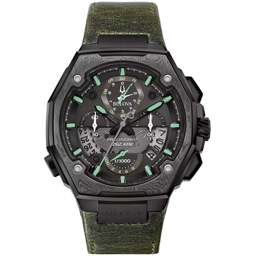 Marking the 10th anniversary of the Precisionist, the Precisionist X Special Edition is a celebration of unparalleled accuracy. The special edition timepiece features a distinctive black stainless steel case with a gray Damascus steel top ring insert. The black dial features a calendar window and a view into the proprietary Precisionist eight-hand chronograph high-performance quartz movement. The fine green leather strap is complete with a deployant buckle. The case features a curved sapphire crystal with AR coating, screw down case back, and water resistance to 50 meters. Case size 58mm. The Precisionist X Special Edition arrives in an elegant presentation box with plaque.