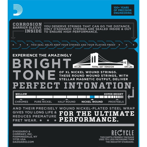 "EJ21, D'Addario's most popular round wound ""jazz"" set, features a wound 3rd/G string for greater resonance and a tighter feel. Can also be used for down tuning.- Features a wound 3rd/G string, optimal for ""jazz"" style playing and some drop tunings- Round wound with nickelplated steel for distinctive bright tone- Environmentally friendly, corrosion resistant packaging for strings that are always fresh- Made in the U.S.A. for the highest quality and performance- String Gauges: Plain Steel .012, .016, Nickel Wound .024, .032, .042, .052- Environmentally friendly, corrosion resistant packaging for strings that are always fresh"