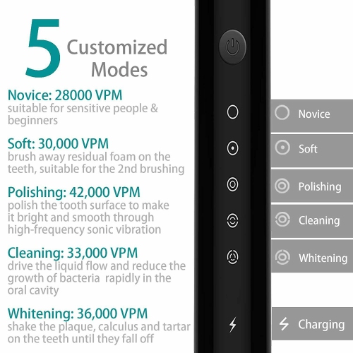 This rechargeable toothbrush with a timer has 6 different modes, can be listed as novice mode, gentle mode, clean mode, bright white mode, polishing mode and massage mode, suitable for different people, you can change to the effect you want.