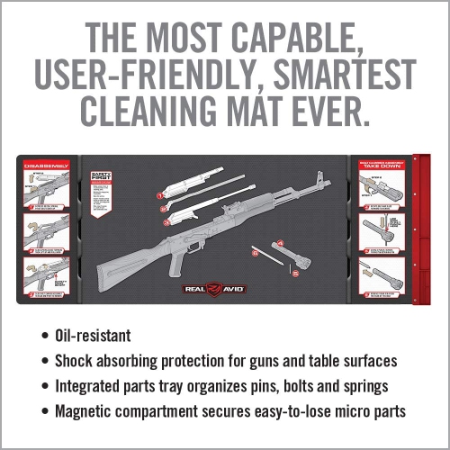 It's large enough to handle the most popular field-stripped Russian rifle with the visible instructions to get you there. The attached parts tray ensures your pins, bolts and springs are never lost again. The oil-resistant surface allows you to properly clean your gun without ruining the kitchen table. The only thing this mat can't do is help you to master the Russian language.