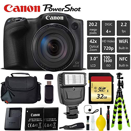 Canon PowerShot SX420 is Digital Point and Shoot 20MP Camera + Extra Battery + Digital Flash + Camera Case + 32GB Class