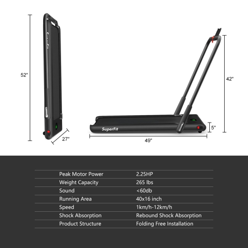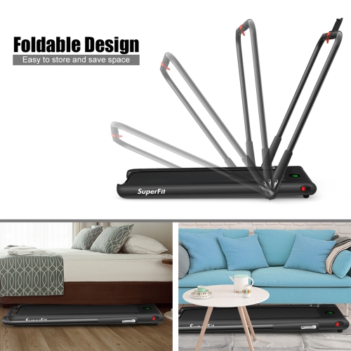 This 2 in 1 treadmill is suitable for office, gym and home use to help have a healthy body. You can use it to walk steadily or run fast to shape your body. Built-in powerful 2.25HP motor helps you thoroughly workout your body. Low noise design gives you a quiet sporting environment. 5 layers non-slip running belt will greatly absorb shock to provide cushioning for knee, muscle and joints. You can connect this treadmill to your phone through the built-in Bluetooth, so you can enjoy music and movies while exercising. Use the remote controller to change the speed or stop the running machine. And the LED display makes it easy for you to track speed, distance, time and calories when you exercise. The front wheels together with the foldable design will help you move or store it in a small place. Start exercising now!