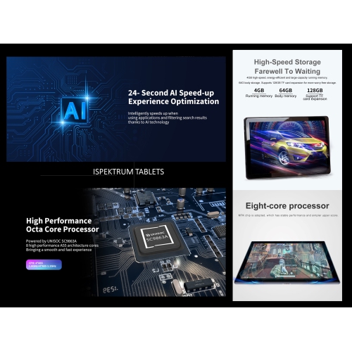 Powered by the latest 64-bit Octa-Core high-performance processor UNISOC SC9863A CortexTM A55 MP8 clocked at 1.6GHz with 4GB RAM 64GB storage, providing a superior experience of entertainment, browsing, games, and shopping for everyone in the family and office.