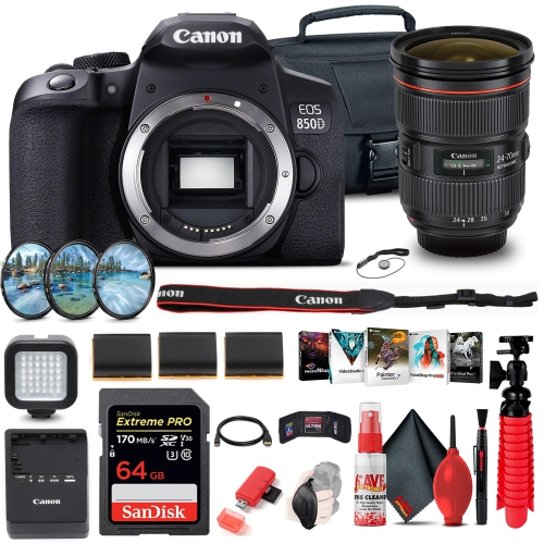 Designed for first-time shooters, but capable enough for advanced imaging tasks, the Canon EOS Rebel 850D is a versatile DSLR with well-rounded photo and video capabilities. Featuring a 24.1MP APS-C-format CMOS sensor and DIGIC 8 image processor, high-resolution stills and UHD 4K video recording are supported, along with a wide ISO 100-25600 sensitivity range to suit working in a variety of lighting conditions. Benefitting the imaging attributes, the sensor's design also facilitates Dual Pixel CMOS AF, which uses phase-detection autofocus for quick, accurate, and smooth focusing performance when recording movies or shooting stills in live view. When shooting stills using the optical viewfinder, a 45-point all cross-type phase-detection system is used for quick and accurate focusing in a variety of shooting scenarios.