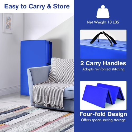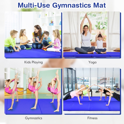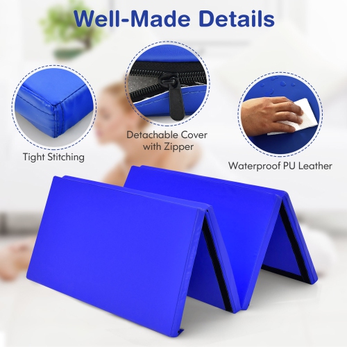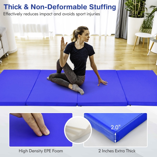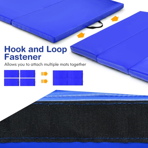 This 8' x 4' gymnastics mat provides ample space for not only gymnastics and tumbling but also fitness, stretching, yoga and other application. Filled with 2'' high density EPE foam, this cushioned exercise mat can protect your body from getting injured, specially important for kids and beginners. The PU leather cover can be directly cleaned with water. Equipped with smooth zipper, you can also detach the cover for more convenient cleanup. The hook and loop fastener on the side of the tumbling mat is used to combine with other mats to create more exercise space. After use, the gymnastics mat can be folded in a compact size and carry easily with 2 handles.