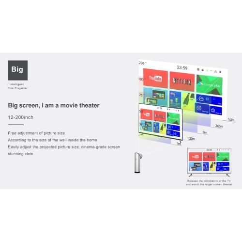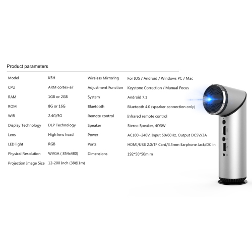 This mini DLP intelligent Pico Projector is powered by American DLP imaging technology and German LED light source and operates on Android 7.1. It comes with 6000mAh Lithium Battery. The mini projector can be used via HDMI, USB ports. iOS and Android phones compatible. Built in YouTube, Netflix and access to Android app store. Connection established by HDMI is the best and most stable. Big Screen – Free adjustment of picture size with manual keystone correction and adjustment. You can adjust according to the size of the wall at your home. Projection screen size 20” – 200”.Conveniently connect to iOS or Android device using latest WiFi, Eshare and screen Mirroring technology and app. We recommend Eshare app for android users and ‘Screen Mirroring’ option for iOS users. Master with one hand - Subversion routine new concept design – 90° rotatable lens and is equipped with 100 ANSI Lumens bulb. It supports 1080P Full HD Display with High-Fidelity Bluetooth Speaker. Its compact design makes it convenient to use while lying down and sitting. This mini DLP compact and lightweight projector only weighs around 440g. It can be store in a backpack or handbag and can be carried along anywhere you want. Projector is crafted from One-Piece tough aluminum-magnesium alloy body. Its Golden hoop creative design enables 90° rotation of lens and can be carried along easily. It can be positioned on a Tripod mounting or flat base – self contained bracket and its unique shape and flexibility allows projecting content on white walls and ceilings.