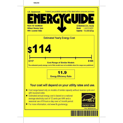 Description:It’s important to get the right air conditioner for the job! The LG LW1516ER is ideal for cooling medium to large rooms up to 800 sq. ft. This ENERGY STAR® certified unit has 3 cooling and fan speeds and a 24 hour timer to create a cooling schedule. 4-way air deflection lets the flow of air be directed where it's needed most whether cooling, dehumidifying or just circulating air. If there is a power outage, the auto restart feature will automatically turn your unit back on when power is restored. Other features include a remote control, easy window installation kit, removable, washable filter and a check filter alert.ENERGY STAR CERTIFIED - This air conditioner has met the high standards of the ENERGY STAR Program using energy-efficient technologies that translate into electricity savings. | MULTIPLE FAN SPEEDS - 3 cooling and fan speeds with Auto Cool allow you to customize your cooling. | MAXIMUM USABILITY - Easy to use electronic controls with remote | AUTO RESTART - After a power failure, Auto Restart will automatically turn the unit back on when power is restored | COOLS ROOMS UP TO 800 SQ. FT. - LW1516ER is ideal for cooling medium rooms (20' X 40')