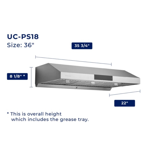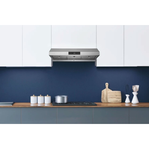 This ventilation hood’s clean and sharp lines, industrial styling, and flawless stainless steel body make it the perfect professional style extractor fan for discerning home chefs. The contemporary under cabinet range hood features the functionality you would expect from a premium kitchen ventilation appliance, all controlled by a smooth and understated digital screen.