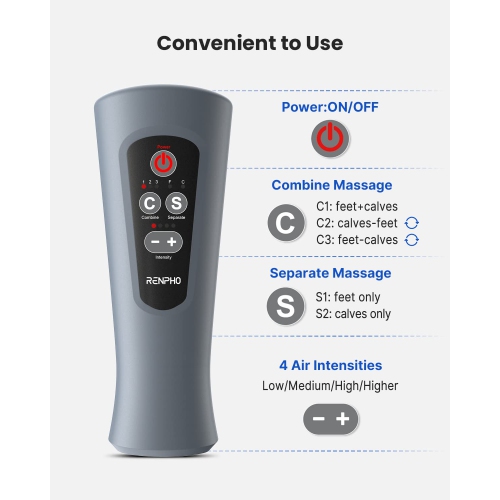 This Leg Massager massages your feet, calves. There are 3 massage sequences and 2 individual massage areas to give you different massage experiences.