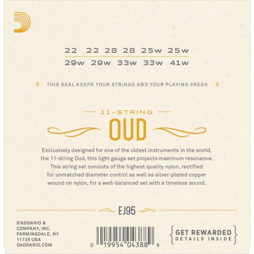 D'Addario J95 strings are designed specifically for the oud. D'Addario oud strings are made with rectified clear nylon and silverplated copper wound bass strings.