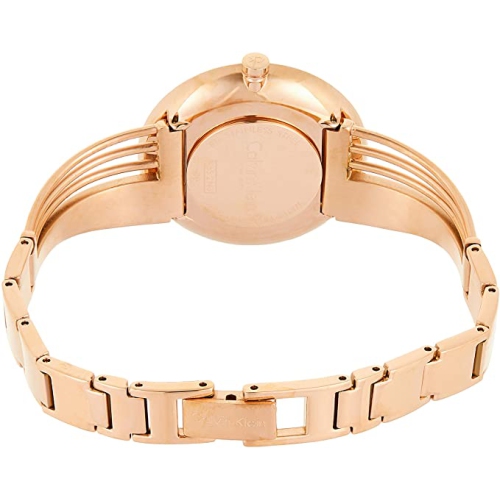 Rose gold PVD stainless steel case and bracelet. Fixed rose gold PVD bezel. Silver dial with rose gold-tone hands. No markers. Dial Type: Analog. Quartz movement. Scratch resistant mineral crystal. Pull / push crown. Solid case back. Round case shape. Case size: 34 mm. Case thickness: 6 mm. Band width: 18 mm. Jewelry clasp. Water resistant at 30 meters / 100 feet. Functions: hour, minute. Drift Series. Casual watch style. Watch label: Swiss Made. Calvin Klein Drift Quartz Silver Dial Ladies Watch K6S2N616.