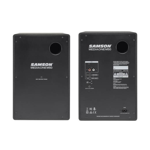 The Samson MediaOne M50 Powered Studio Monitors are a full-range speaker solution for all your desktop and multimedia applications. Whether you're listening to music, producing tracks, watching videos or gaming, this stereo monitor pair features an internal amplifier, wood construction and high-quality components that bring big, balanced sound to your desktop space.