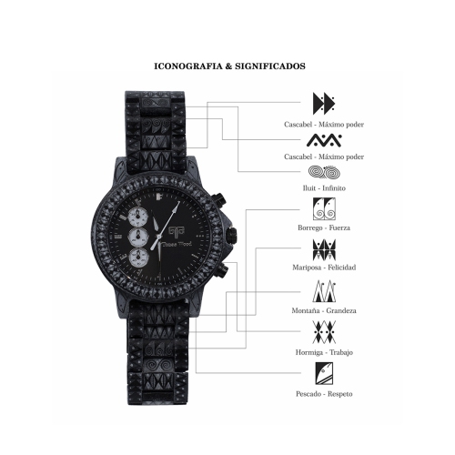 We offer a wooden watch hand-painted by Mexican artisans. All of our watches feature sapphire crystal and stainless steel. Known worldwide for its precision and quality we offer a Citizen Miyota Co. Japanese quartz chronograph movement with 6 hands and 3 vertical eyes. Mayan numerals with luminescent material in numerals and hands. Laser engraving on the watch case and components. 2 button deployment clasp. Diameter 42mm, Length 20mm. Zapotec iconography with special meaning on the entire surface of the Watch. Adjustable strap. Splash-free in terms of water resistance. 12-month warranty from the time of purchase. Technical sheet with the meaning of its