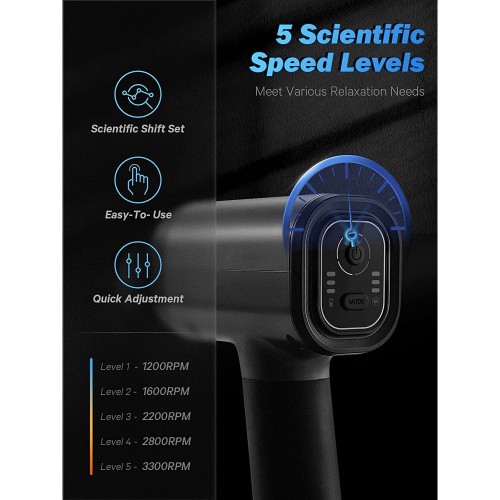 1.Multi-Function Display: 3 Power level displays the best operating state of the massage gun; 5 percussion intensity enables you to choose different percussion strength; 3 built-in modes suits for various muscle massage (neck backhand massage and so on), warm-up, relaxation, or deep massage, meeting your relaxing needs after a workout, fastening muscle recovery and improving exercise status.