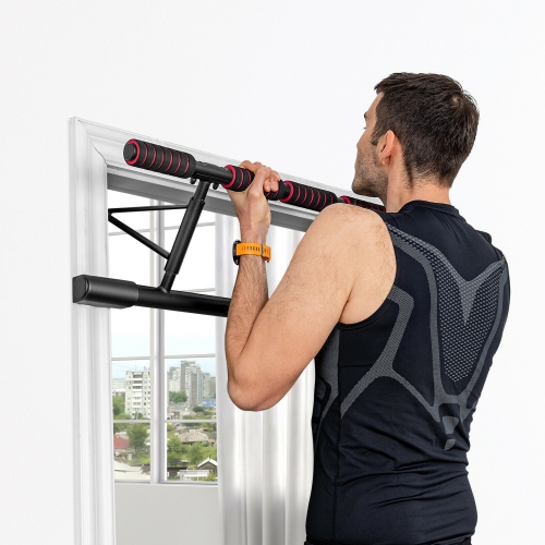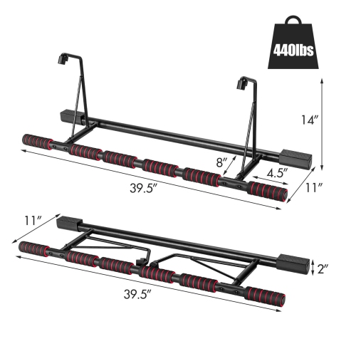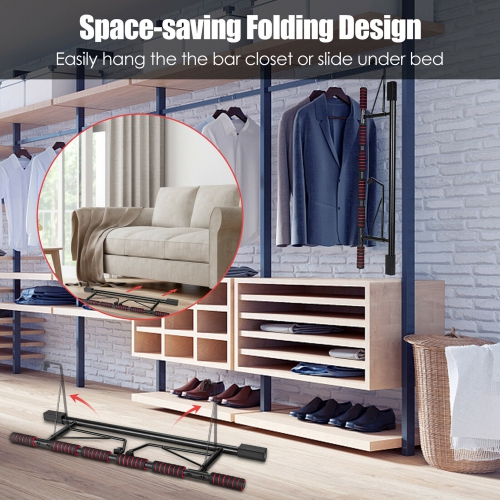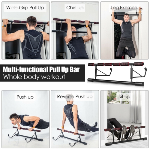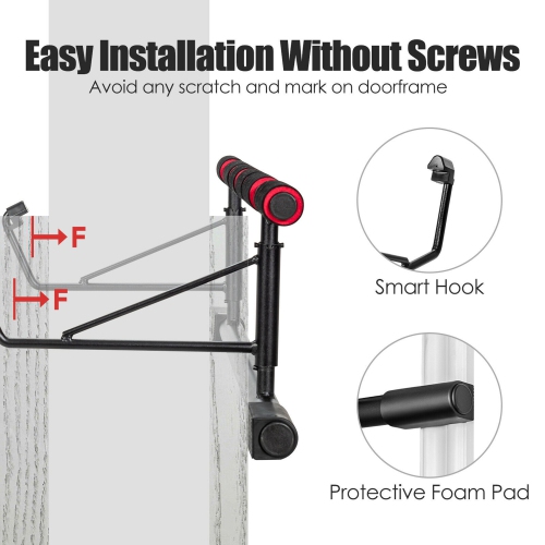 This foldable pull up bar fits in exactly with your wishes. Coming with 6 foam padded grips, the pull up bar allows you to perform different workouts such as pull-ups, chin-ups, leg lifts, sit-ups, etc. Holding grips on different parts effectively exercises various parts of your body, which promotes the workout effect greatly. All grips are coated with soft foam so as to offer a comfortable training experience. Meanwhile, protective pads on the bar serve to protect the door and floor from scratches, which absorb the weight so as to avoid any damage to the door frame. There's also no need to worry about installation. Just open the smart hook and put the pull up bar on the door. Then you can take your exercise to a new level with this pull up bar.