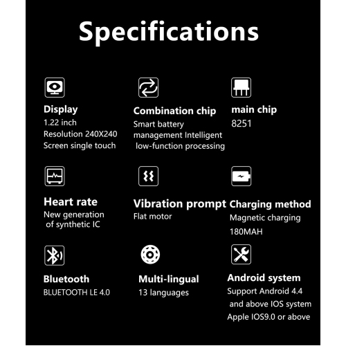 COMPATIBILITY: Support Android 4.4 and above, iOS 9.0 and above, BT 4.0 version. Bluetooth: Bluetooth 4.0. Charging Time: about 60min. Working Time: about 7-10 days. Standby Time: about 20 days