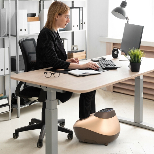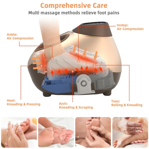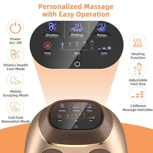 Our shiatsu foot massager with a novel and fashionable outlook and multiple foot-relief functions can be the perfect gift for your beloved ones! It has 3 massage functions (tuina health care function, scraping massage function, full foot relaxation) and 3-level massage speed for you to customize your massage experience. Not only that, it is designed with a heat therapy function that would keep a constant heating temperature between 104-140℉. Through deep kneading, air compression, scraping, pressing, rolling, and heating massage, the feet massage machine would effectively relieve pain, plantar fasciitis, and increase relaxation. Besides, it comes with a foot-size adjustable function allowing you to adjust foot size from 5-12 ft.