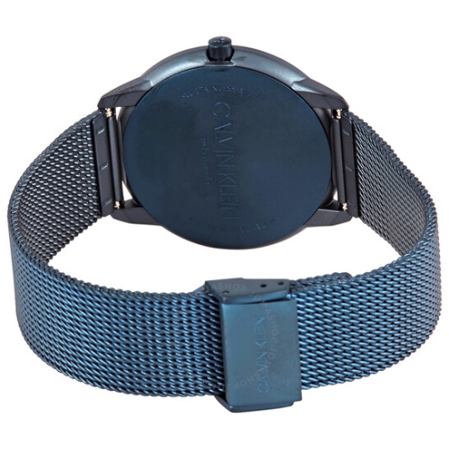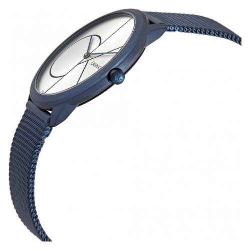 Blue PVD stainless steel case with a blue PVD stainless steel mesh bracelet. Fixed blue PVD bezel. Silver dial with blue hands. No markers. Dial Type: Analog. Quartz movement. Scratch resistant mineral crystal. Pull / push crown. Solid case back. Round case shape. Case size: 40 mm. Case thickness: 7 mm. Band width: 20 mm. Fold over slip through clasp. Water resistant at 30 meters / 100 feet. Functions: hour, minute. Casual watch style. Watch label: Swiss Made. Calvin Klein Minimal Silver Dial Men's Watch K3M51T56.