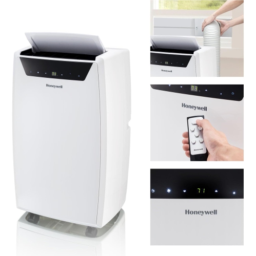 Stay cool and dry with the MN4HFS9 Honeywell Portable Air Conditioner with Heater. The Honeywell 14,000 BTU Heat and Cool Portable Air Conditioner combines 4-in-1 technology in one sleek body, cooling and dehumidifying areas up to 700 sq. ft. and heating areas up to 500 sq. ft. With cooling and heating functions in one, this appliance is useful year-round, keeping you cool during hot summers and warm during cold winters. It features an auto-evaporation system, a reliable dehumidifying function, and a traditional three-speed fan function to deliver optimum cooling, dehumidification, and fresh ventilation. The full-function remote control allows you to operate each feature from across the room. Unlike a fixed air conditioner, the Honeywell Portable Air Conditioner requires no permanent installation, and smooth-gliding wheels make sliding it from room to room a breeze. This portable air conditioner comes with everything needed, including a flexible exhaust hose and an easy-to-install window venting kit.