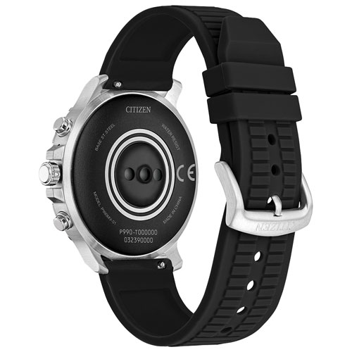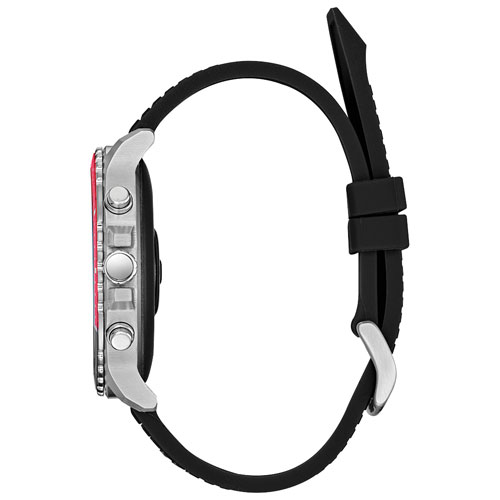 46mm silver-tone stainless case with 3-piece construction, a black anodized aluminum top ring, and a rugged bezel design with a black silicone band delivers sporty style
