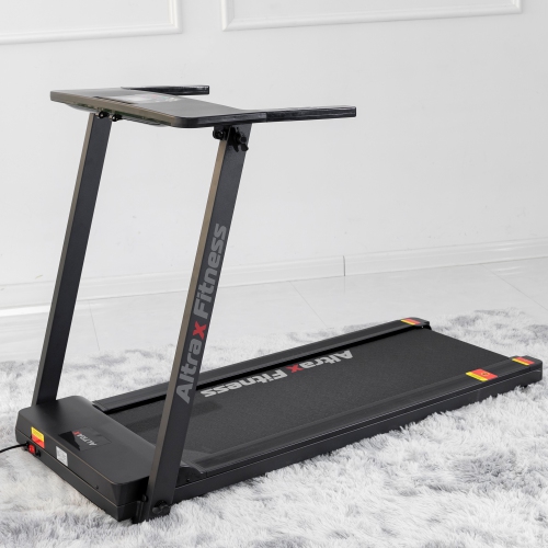 The ALTRAX FITNESS AX-T10 is a folding treadmill that provides a truly effective approach to weight loss and muscle toning. Compact and sturdy with its powder-coated steel frame, the AX-T10 allows you to perform essential cardio exercises within the comfort of your home. Its powerful and energy-efficient motor produces smooth and seamless operation whilst the anti-slip belt and soft-grip handlebar make your session a comfortable and controlled experience. A user control panel with a LCD display lets you adjust the speeds between 1 km/h and 14 km/h and monitor other parameters relevant to your workout. When all the hard work is done, you can easily fold and store away the compact treadmill easily. Other great features include a safety tether key, smooth wheels for easy mobility and a smart device/tablet holder.