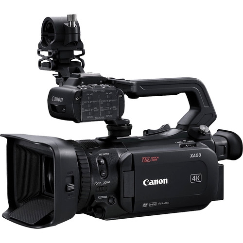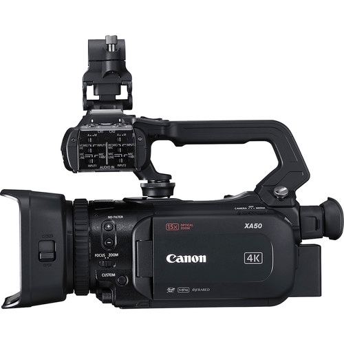 The Canon XA50 Professional UHD 4K Camcorder is a compact, lightweight camera featuring UHD 4K capture, a 1 CMOS sensor, two XLR audio inputs, and one mini-HDMI output which fits right into the ENG category for documentary or journalism-style productions.The XA50s optics include an integrated 15x HD optical zoom and a nine-bladed circular iris for more natural highlights, and wide DR gamma support for low-light recording. The cameras pro-style features include Dual Pixel and Contrast autofocus, fast- and slow-motion recording, full manual control, optical and electronic image stabilization, a 3 touchscreen LCD, user-assignable buttons, infrared mode, and a DIG!C DV 6 image processor with high sensitivity and low noise. The XA50 also has display monitoring features such as zebra, color bars, and test tone and a built-in neutral density filter mechanism offering ND4, ND16, and ND64 options.The camera records UHD 4K30 and Full HD 1080p60 captured to dual SD card slots, and outputs to a mini-HDMI port. The dual SD card slots allow for automatic switching from one card to another, as well as simultaneous recording to both. The camera can output up to 1920 x 1080p 10-bit 4:2:2 video at 59.94 fps via its mini-HDMI output. On the audio side, the XA50 features up to four channels of LPCM audio with manual/automatic recording levels, two XLR inputs with phantom power, and a 3.5mm stereo mini input. It features a built-in stereo microphone as well as a headphone jack. The cameras functions can also be controlled by the separately available RC-V100 remote control. Features