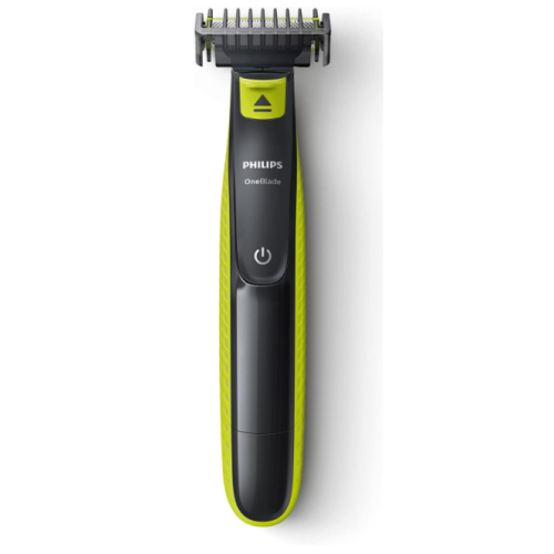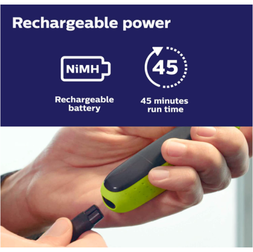 Rechargeable OneBlade can trim, edge, and shave any length of hair.