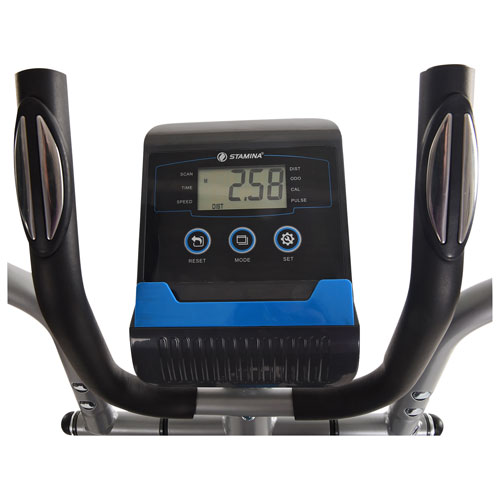 Scanning LCD monitor displays time, speed, calories, distance, and total distance to help you stay on track