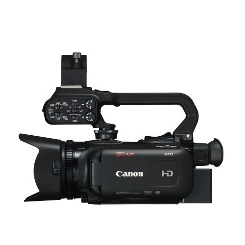The Canon XA11 Full HD Camcorder is a compact run-and-gun camera that is suitable for ENG, event coverage, and independent and documentary filmmaking. The camera features a 1/2.84, 1920 x 1080 CMOS sensor that captures video at various frame rates up to 59.94p, including a 24p mode for a more cinematic feel. The integrated Canon 20x HD optical zoom lens has a 35mm equivalent zoom range of 26.8 to 576mm, and features an 8-bladed iris to render highlights in a more natural manner.The final piece in the image chain is Canons Digic DV 4 image processor. This high-speed image-processing engine powers Canons Dynamic IS (Image Stabilization) mode reducing image distortion over traditional up-down, left-right image stabilization by adding correction for camera roll in three axes. The power of the Digic DV 4 allows the camera to simultaneously encode your video to two different codecs and bit rates, allowing you to have web-ready versions of your master footage available as soon as you stop recording.The XA11 features both a 3.5 OLED touch panel view screen with a 10,000:1 contrast ratio, and a color electronic viewfinder with 1,560,000 dots of resolution. The camera features full manual control and auto modes for exposure, focus, white balance, gain, and shutter speed. The camera provides professional features such as a pre-record buffer, peaking, zebra bars, color bars, and reference tone. The zoom speed is adjustable with variable, constant (with 16 different speed levels), fast, normal, and slow settings. The camera features a detachable top handle with zoom toggle, record start/stop, IR emitter, tally light, accessory shoe, external mic holder, two XLR connectors with phantom power, and manual audio level controls. The XA11 includes a built-in headphone jack and a Mini HDMI connector, and outputs composite video and audio via a 3.5mm mini-jack.Two built-in SD/SDHC/SDXC memory card slots allow you to record video to available media cards in both slots at the same time. This allows you to create an instant backup copy for archiving and data protection. You can also capture high-resolution AVCHD or MP4 video files on one card while creating a lower data rate MP4 more suitable for the web on the other card. When using two media cards and the camera is in Relay mode, there is no need to stop shooting to swap out a full media card; when one card becomes full, recording seamlessly switches to the other card. Built-in dual-band Wi-Fi allows you to FTP video files directly from the camera, or play back footage from the memory cards to Wi-Fi enabled TVs and computers. You can also remotely control camera functions from a smartphone or tablet over Wi-Fi, freeing you from remote cables.Canon Native 1920 x 1080 CMOS Sensor