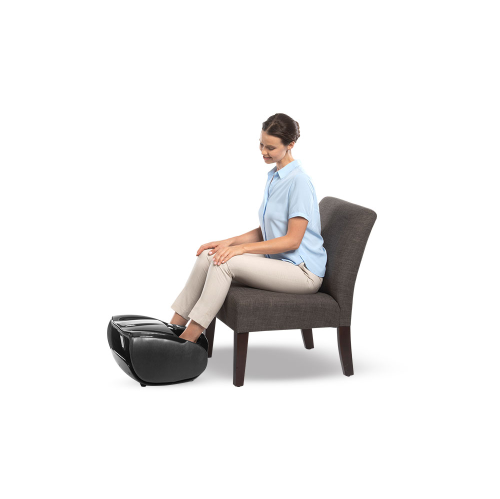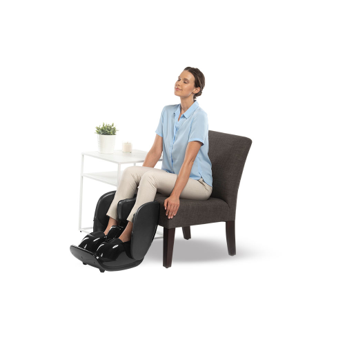 The main unit is the advanced foot massager with advanced reflexology roller zones and soothing airbag compression. Flip up the optional hood to expose the second massager, which simultaneously targets calves and ankles. Fold down for compact storage.