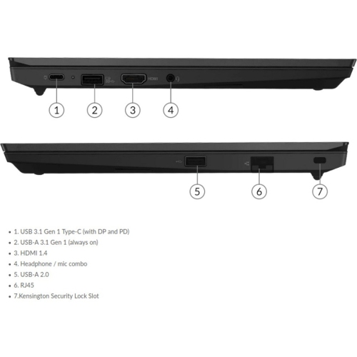 Go online with Wi-Fi 6 and Gigabit Ethernet via the RJ-45 port, or connect to wireless peripherals using Bluetooth 5.2. USB 3.2 Gen 1 and 2.0 Type-A ports support wired connections, while a USB 3.2 Gen 1 Type-C port can be used for data, power delivery, or video via DisplayPort Alt Mode. An HDMI port is present too. In addition to a webcam privacy shutter, safety features include user, supervisor, and drive passwords, a TPM, and Kensington Lock slot. In addition to a battery life of up to 12.8 hours, this laptop can recharge up to 80% in just an hour. The Lenovo 14" ThinkPad E14 Gen 3 Laptop runs on the Windows 10 Pro 64-bit operating system.