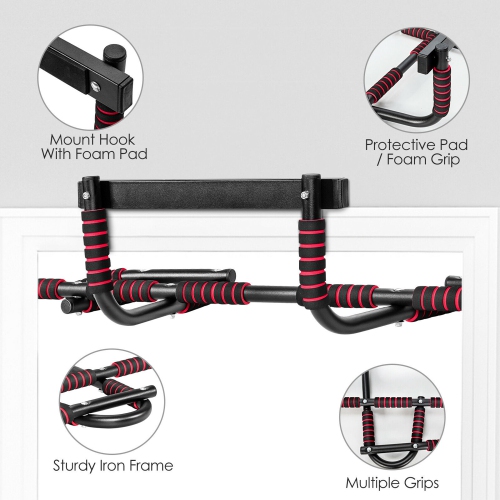 Enjoy indoor training and exercise with this pull up bar. This is the ultimate body sculpting and strength building tool that you need. The sturdy iron material allows for daily use and can support up to 300 lbs, which avoids deformation and keeps steady during training. More importantly, you can hold different grips on the pull up bar so as to acquire different training effects. With the bar, you can incredibly build up muscles over your body, such as shoulders, chest, back, biceps, triceps and core muscles. You can hang it on the door or put it on the floor for multi-purpose use. What's more, the pull-up perfectly fits most doors and comes with easy installation.