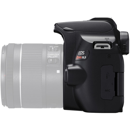 Defined by its notably sleek form factor, the black Canon EOS Rebel SL3 is a versatile DSLR offering an ideal mix of stills and video capabilities. Featuring a 24.1MP APS-C-format CMOS sensor and DIGIC 8 image processor, high-resolution stills and UHD 4K video recording are possible, along with a wide ISO 100-25600 sensitivity range to suit working in a variety of lighting conditions. In-camera 4K time-lapse movie creation is also possible for creatively depicting subjects over time. Benefitting the imaging attributes, the sensors design also facilitates Dual Pixel CMOS AF, which uses phase-detection autofocus for quick, accurate, and smooth focusing performance when recording movies or shooting stills in live view. When shooting stills using the optical viewfinder, a 9-point phase-detection system is used for quick and accurate focusing in a variety of shooting scenarios.Within the compact body design, a large 3.0 1.04m-dot touchscreen LCD is featured for intuitive settings control and live view monitoring, and it uses a vari-angle design to permit easier viewing from high and low working angles. Additionally, built-in Wi-Fi is available for quick and convenient pairing with a smartphone or tablet for wireless image sharing, and Bluetooth is also featured for image sharing to and remote camera control from a mobile device.24.1MP APS-C CMOS Sensor and DIGIC 8 Image ProcessorBoth a 24.1MP APS-C CMOS sensor and DIGIC 8 image processor are used to deliver high sensitivity and fast camera performance to suit both stills and video applications. A flexible native ISO 100-25600 range suits working in a variety of lighting conditions, and the processing capabilities minimize noise for notable clarity. The processor also enables up to 5 fps continuous shooting as well as UHD 4K video recording and a 4K time-lapse movie mode.UHD 4K Video RecordingIn addition to stills recording, the SL3 also supports UHD 4K24p video recording, as well as Full HD and HD recording. Video recording is benefitted by the inclusion of Dual Pixel CMOS AF and the Movie Servo AF focusing functions, as well as the touchscreen design of the LCD monitor for intuitive control. Movie Digital IS also helps to steady recordings by minimizing the appearance of camera shake across five axes for smoother footage. Additionally, an external microphone jack is incorporated in the body design for greater control over your recorded sound.