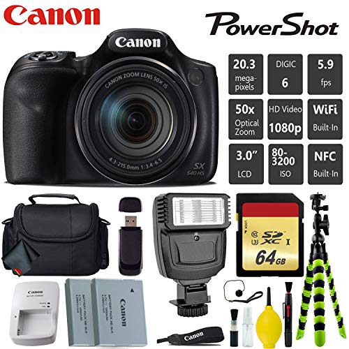 Canon PowerShot SX540 HS Digital Point and Shoot 20MP Camera + Extra Battery + Digital Flash + Camera Case + 64GB Class