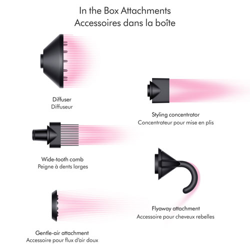 Includes the flyaway attachment, a styling concentrator, a diffuser, a gentle air attachment, a wide-tooth comb, and a presentation case