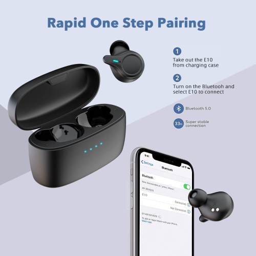 Secure active fit – E10 wireless earbuds can perfectly fits the ear contour to ensure pain-free during long time of wearing. Smart support & decompression design brings more comforts. compact design makes E10 earbuds more suitable for sports and even women and kids can wear it easily without falling off. Crisp and clear sound – Enjoy crystal sound effect with excellent accuracy & clarity. E10 Bluetooth earbuds can bring perfect balance between strong bass and clear treble to display open and surging sound field as well as subtle sound details, so as to control the sound more precisely and create real & rich sound. No audio dropouts + super stable – With strong true wireless Bluetooth 5, E10 wireless earbuds can provide super stable audio connection and high-quality voice even in complicated environments. Plus, E10 earbuds can achieve fast auto pairing and device connection when taking out from charging case. Simple touch controls & button decompression – Built-in touch sensor can
