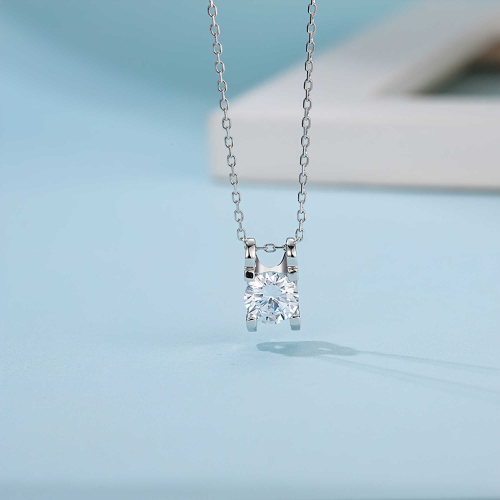 A brilliant choice. This stunning solitaire features a 1 CT D-E color VVS1-VVS2 clarity round center moissanite in 0.925 white
