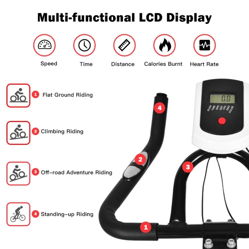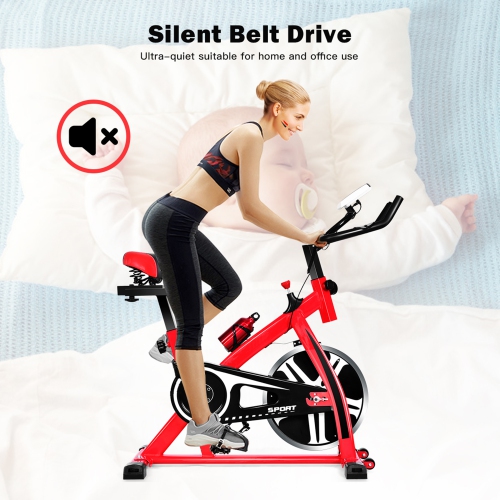 This exercise bike features 18 lbs solid flywheel with belt drive mechanism and wool felt brake pad for smooth and quiet workouts, a convenient adjustable knob for resistance system and emergency brake, fully adjustable PU saddle seat and height adjustable handlebar, a monitor for scan, time, speed, distance, calorie, odometer and pulse, and 4 horizontal adjustment knobs to keep the bike stable on different surfaces. Combined, the bike accommodates a wide variety of riders, producing invigorating yet quiet workouts. Other features include a heavy-duty steel frame, foamed rubber handrails, and aluminum alloy foot pedal with toe straps. With this bike, exercising in the comfort of your own home will never be so easy, convenient, or fun!
