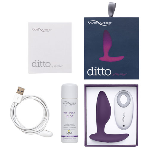 Includes a USB cable, wireless remote control, and a 2ml sample bottle of We-Vibe personal lubricant