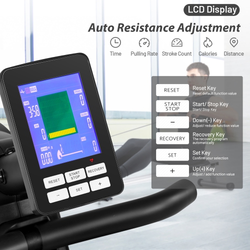 LCD monitor records time, stroke count, pulling rate, calories and distance in time