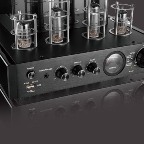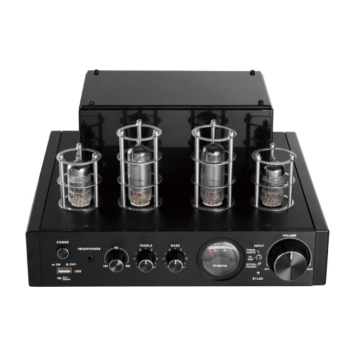 The steel chassis is sleek and durable, with a brush metal front panel and a protective cage over the tubes. The hole metal body is using high gloss piano black finish.