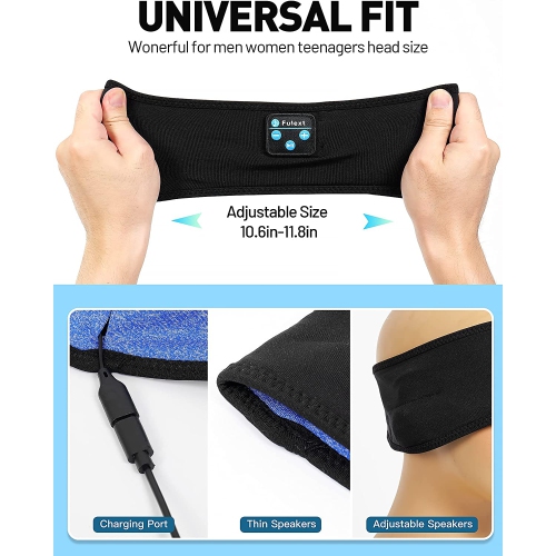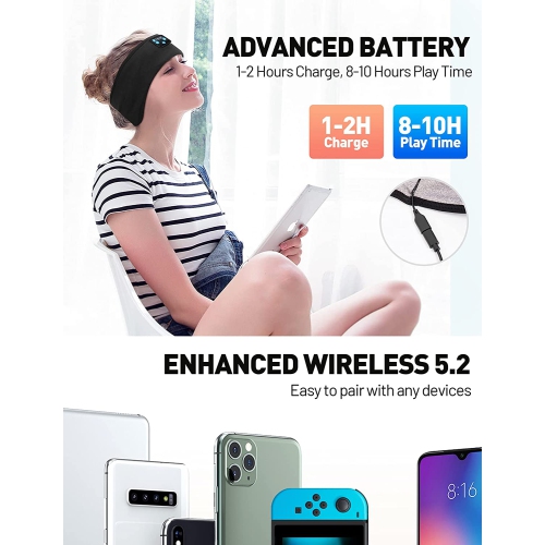 [Sleep Headphones & Sports Headband& Sleep Mask 3 in 1] Having this sleep headphones, you can listen to your music without wearing additional headphones and won't be disturbed by your mess hair and sweat.and never miss any incoming calls. [Ultra-long Standby Time] Built-in ultra low-power and rechargeable battery, this bluetooth headband headphones can provide up to 10-12 hours of playing time with only 2 hour charging time. Unisex sleep headphones for Women&Guys-Wide band is great for any activity such as cycling, spinning, skiing, yoga, meditation, and Gym workout. [Ultra-thin speaker and V5.2 bluetooth tech] The speaker's thickness is only 0.25 inches, and the device control module sits in the middle of the sleep headphones so it doesn't press down on the ears, making them ideal for side-sleepers.Get rid of falling earplugs.Bluetooth 5.2 version has a wireless range of 45 feet, which guarantees the stability of the Wireless connection. Strong compatibility support smart phones