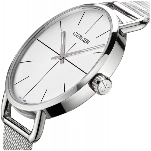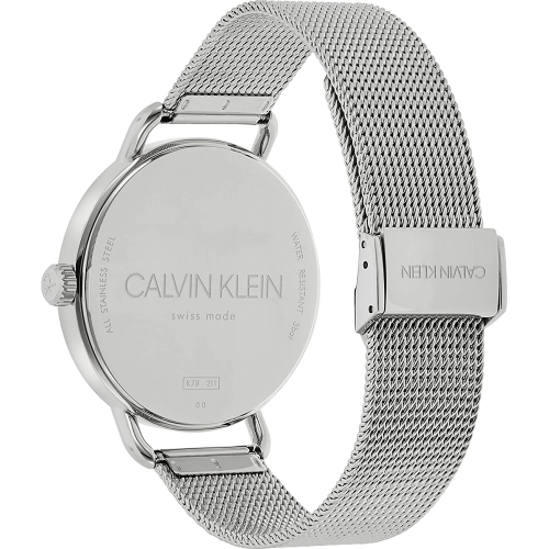 Stainless steel case with a stainless steel mesh bracelet. Fixed stainless steel bezel. Silver dial with luminous silver-tone hands and index hour markers. Dial Type: Analog. Luminescent hands. Quartz movement. Scratch resistant mineral crystal. Pull / push crown. Solid case back. Round case shape. Case size: 42 mm. Case thickness: 9 mm. Band width: 18 mm. Fold over slip through clasp. Water resistant at 30 meters / 100 feet. Functions: hour, minute. Even Series. Casual watch style. Watch label: Swiss Made. Calvin Klein Even Quartz Silver Dial Ladies Watch K7B21126.