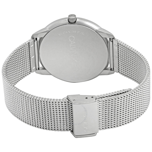Stainless steel case with a stainless steel mesh bracelet. Fixed stainless steel bezel. White dial with silver-tone hands. No markers. Dial Type: Analog. Quartz movement. Scratch resistant mineral crystal. Pull / push crown. Solid case back. Round case shape. Case size: 40 mm. Case thickness: 7 mm. Band width: 20 mm. Fold over slip through clasp. Water resistant at 30 meters / 100 feet. Functions: hour, minute. Minimal Series. Casual watch style. Watch label: Swiss Made. Calvin Klein Minimal Quartz White Dial Men's Watch K3M5115X.