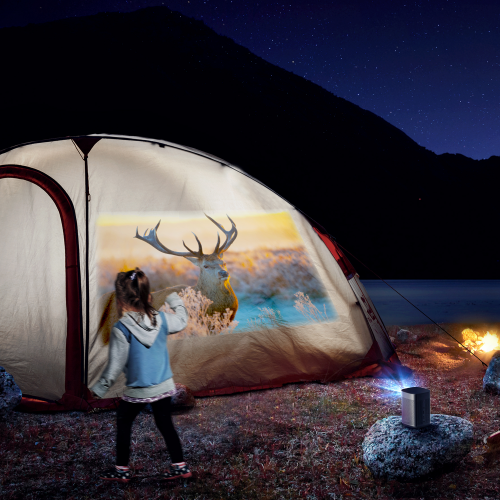 - Portable Smart Projector: Put it down, it adjusts itself automatically. It will adjust itself in a few seconds with autofocus and keystone correction and you're good to go. Tiny adjustable stand on the bottom as well. It is portable, which can travel around your house or other places, a solid choice.