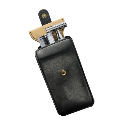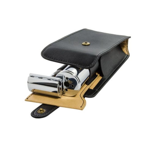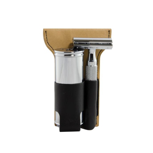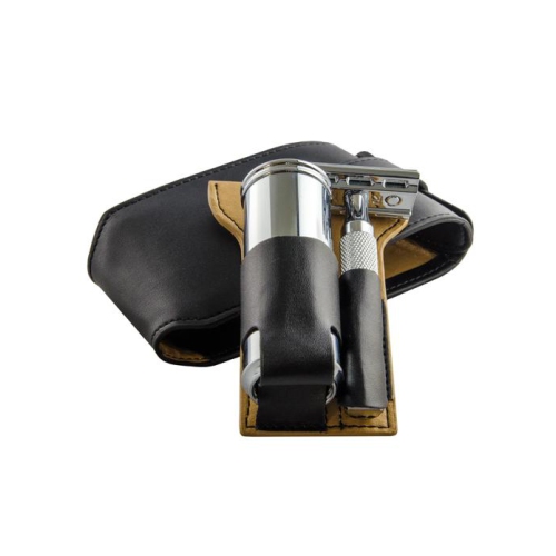 This gift set includes a pure leather holster that carries a Rockwell Razors double edge safety razor and a damp-proof shaving brush that is self-contained to prevent moisture from fouling the bristles.