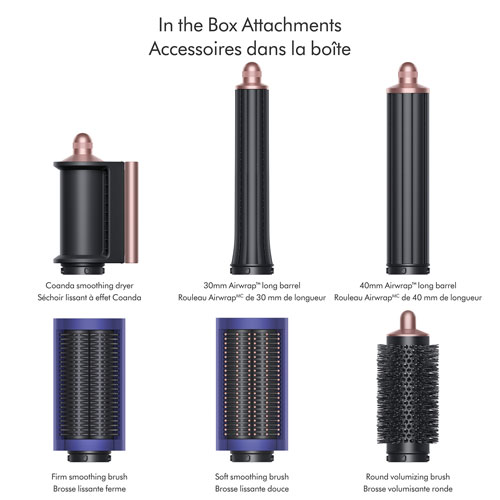Includes a 30mm Long Direction Change Barrel, 40mm Long Direction Change Barrel, Firm Smoothing Brush, Soft Smoothing Brush, Round Volumizing Brush, Coanda Smoothing Dryer, velvet travel wrap, storage case, and a filter cleaning brush