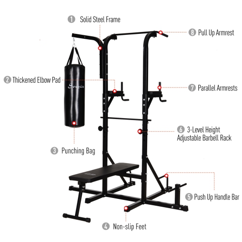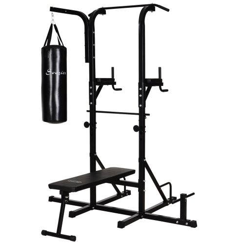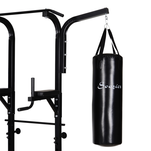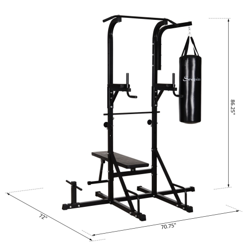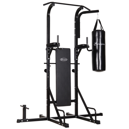Description:Bring the gym home with you with the all-in-one power tower with punching bag from Soozier! This equipment is the perfect addition to your home gym. It includes a punching bag, a knee raise station, a multi-grip pull-up station, a dip station, a push-up station and a sit-up station. With a variety of station and positions, you can strengthen your entire body. Build strong biceps, triceps, back, abdominal core, legs, shoulders and incredible full body strength using a variety of workouts with Soozier multi-function power tower!